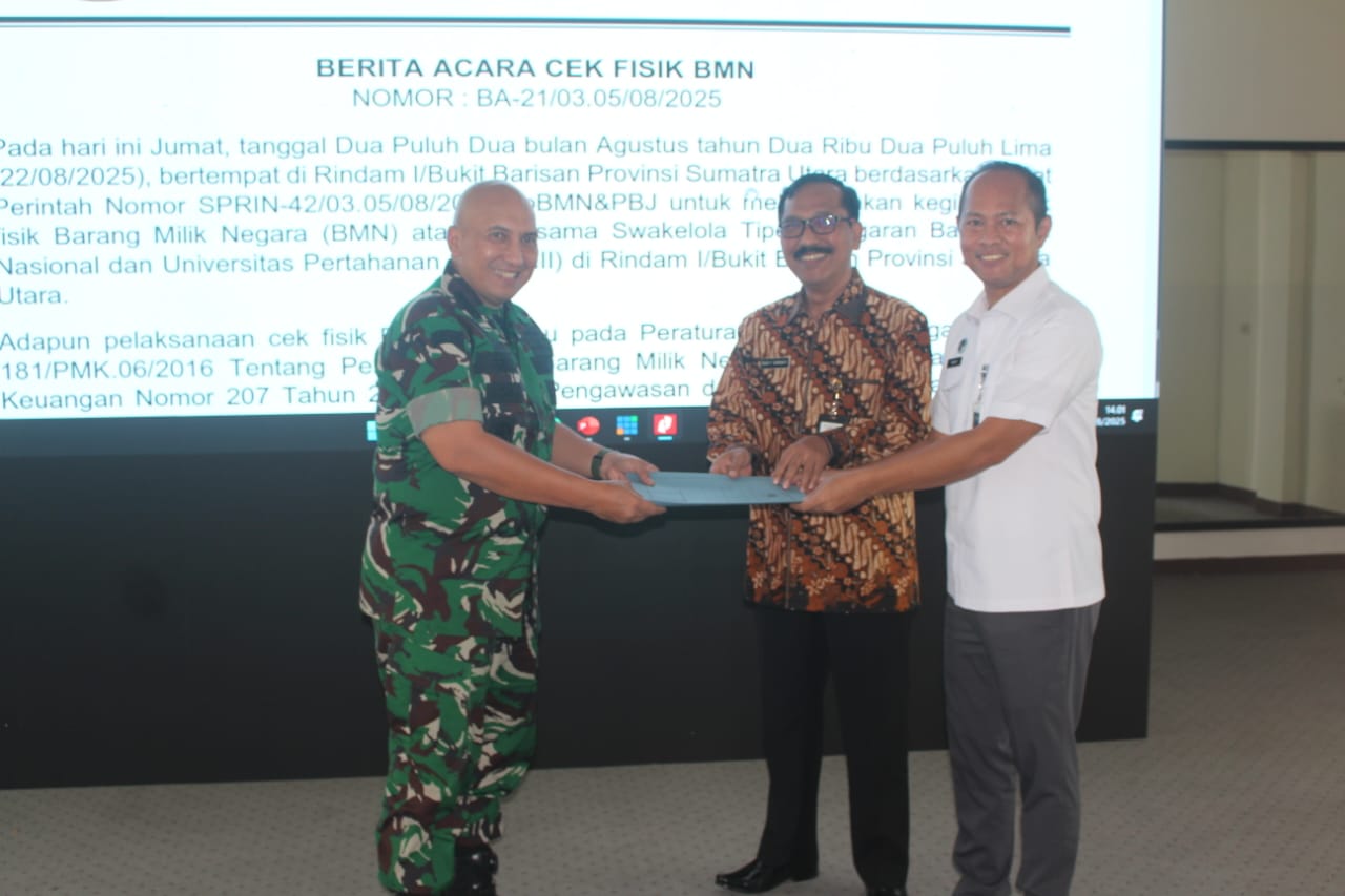 Pematangsiantar – Danrindam I/Bukit Barisan Kolonel Inf Abdul Razak Rangkuti, S.Sos., M.Han., M.Si., menerima Kunjungan Kerja Kepala Biro Pengelolaan Barang Milik Negara (BMN) dan Pengadaan Barang dan Jasa Badan Gizi Nasional RI Ranto, S.P., M.AP., beserta rombongan, bertempat di Lounge I Mako Rindam I/BB, Jumat (22/8/2025). Kunjungan tersebut dilaksanakan dalam rangka Kegiatan Cek Fisik Aset Barang Milik Negara (BMN), terkait Kerja Sama Swakelola Tipe II antara Badan Gizi Nasional dengan Universitas Pertahanan RI (SPPI Batch 3). Dalam kesempatan itu, Danrindam I/BB menyampaikan apresiasi atas sinergi yang terjalin antara institusi terkait, serta menegaskan komitmen Rindam I/BB dalam mendukung kelancaran program kerja sama yang berorientasi pada Optimalisasi Aset Negara dan Peningkatan Kualitas Pendidikan Pertahanan.