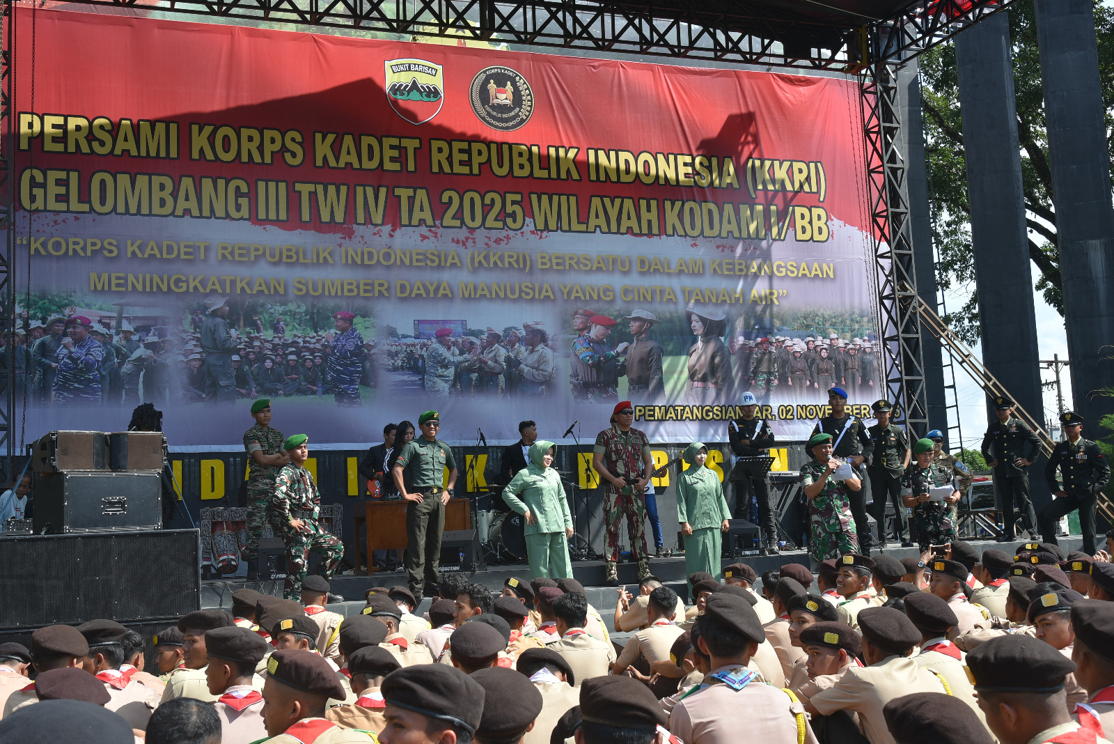 Pematangsiantar – Danrindam I/Bukit Barisan Brigjen TNI Abdul Razak Rangkuti, S.Sos., M.Han., M.Si., mendampingi Pangdam I/BB Mayjen TNI Rio Firdianto pada Penutupan Persami KKRI Gelombang III TW IV TA 2025 wilayah Kodam I/BB, di Lapangan Jenderal Soedirman Rindam I/BB, Minggu (2/11/2025).