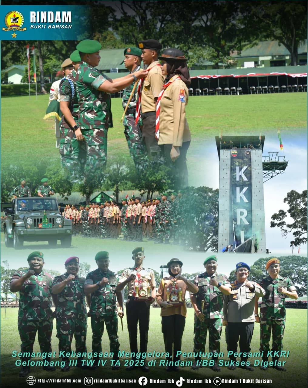 Rindam I/Bukit Barisan sukses menyelenggarakan kegiatan Penutupan Persami KKRI Gelombang III TW IV TA 2025 dengan tertib dan lancar. Para peserta menunjukkan antusiasme, semangat juang, dan kekompakan tinggi selama kegiatan berlangsung. Melalui Persami KKRI di Rindam I/BB ini, diharapkan terwujud generasi muda berkarakter, berjiwa Nasionalis, dan siap menjadi kader bangsa yang tangguh.