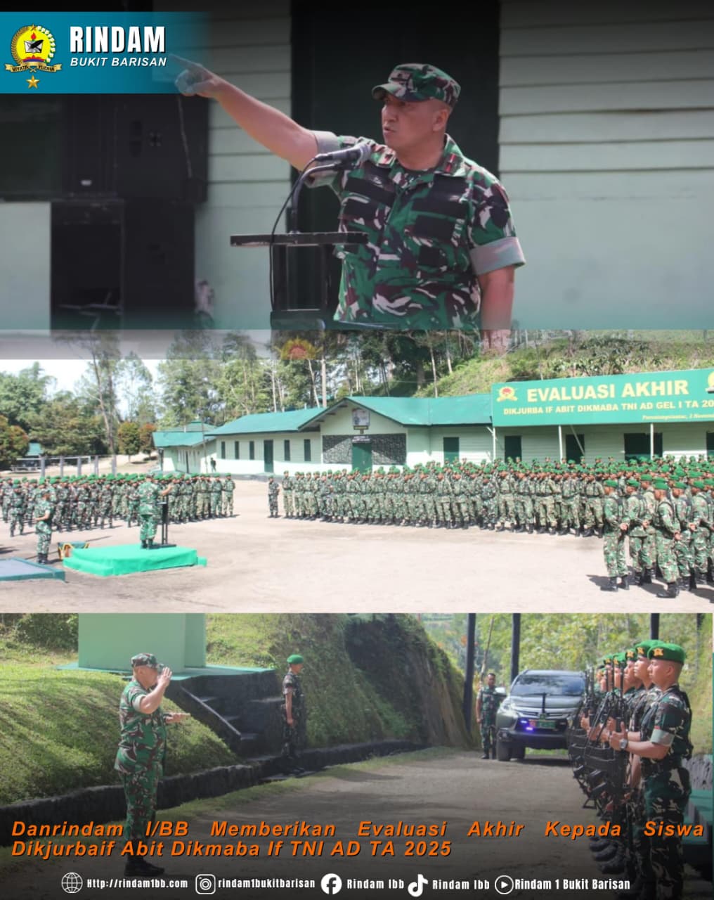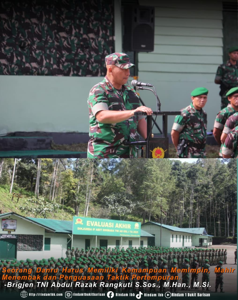 Aeknatolu – Danrindam I/Bukit Barisan Brigjen TNI Abdul Razak Rangkuti, S.Sos., M.Han., M.Si., memberikan Evaluasi Akhir kepada siswa Dikjurbaif Abit Dikmaba Infanteri TNI AD TA 2025, di Lapangan Upacara Aeknatolu Kab. Toba, Senin (3/11/2025). Beliau menegaskan sebagai seorang Komandan Regu, harus memiliki kemampuan memimpin dengan ketegasan dan keteladanan, mahir dalam menembak sebagai unsur dasar profesionalitas seorang prajurit.