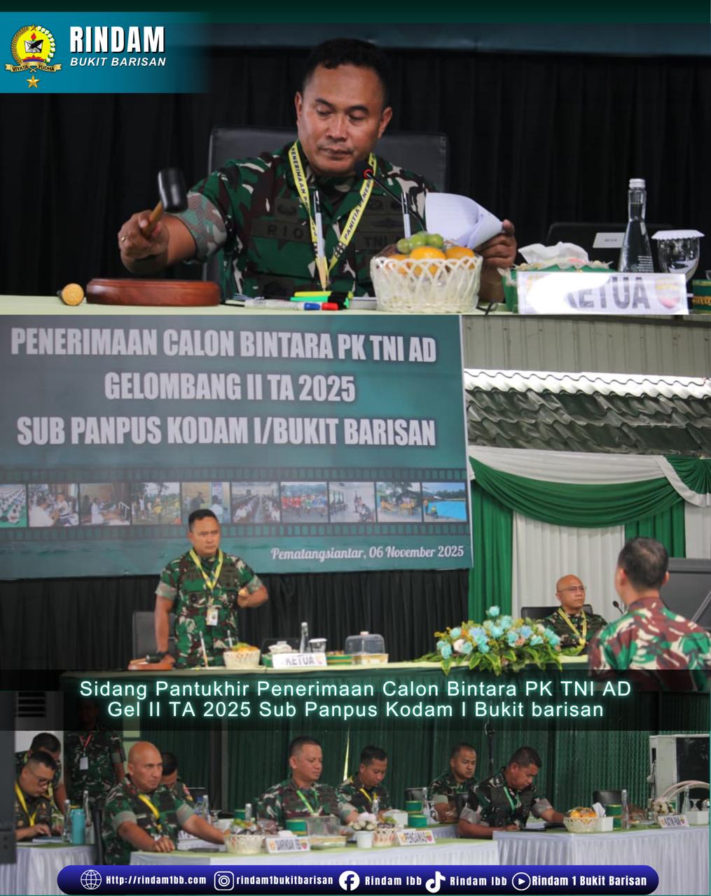 Pematangsiantar – Danrindam I/Bukit Barisan Brigjen TNI Abdul Razak Rangkuti, S.Sos., M.Han., M.Si., ikut hadir pada Sidang Pantukhir Penerimaan Calon Bintara PK Gel II TA 2025 Sub Panpus Kodam I/BB, di Lapangan Tenis Indoor A.H. Nasution Rindam I/BB, Kamis (6/11/2025).