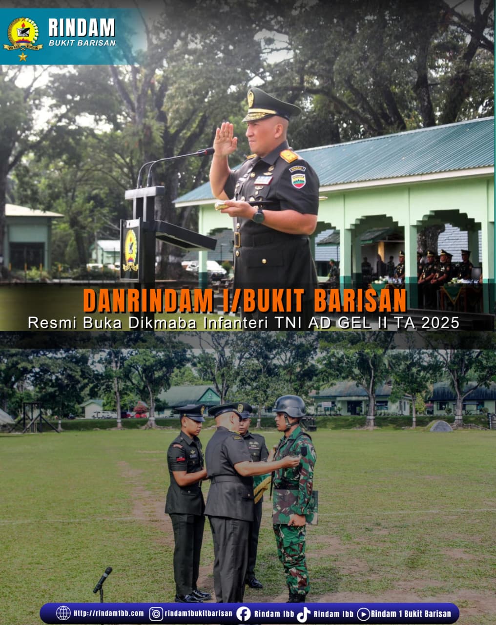 Pematangsiantar – Danrindam I/Bukit Barisan Brigjen TNI Abdul Razak Rangkuti, S.Sos., M.Han., M.Si., secara resmi membuka Pendidikan Pertama Bintara Infanteri TNI AD Gelombang II TA 2025, di Lapangan Jenderal Soedirman Rindam I/BB, Kamis (13/11/2025).